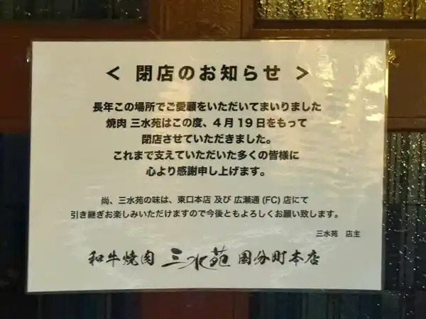 仙台市青葉区国分町の『和牛牛肉 三水苑 国分町本店』が、2026年4月19日(日)をもって閉店をされていたみたいです。