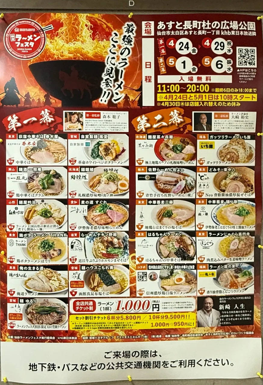 仙台のゴールデンウィークを告げる風物詩『仙台ラーメンフェスタ2026』が、仙台市太白区のあすと長町杜の広場公園で、2026年4月24日(金)から5月6日(水)まで開催されます。(期間中4月30日(木)は店舗入れ替えのためお休み。11-20時、4月24日(金)と5月1日(金)は10時から、5月6日(水)は18時まで)